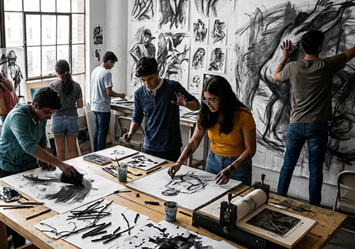 Participants not only create finished works but also develop process thinking, sketchbooks, and visual narratives — essential for art and design admissions.