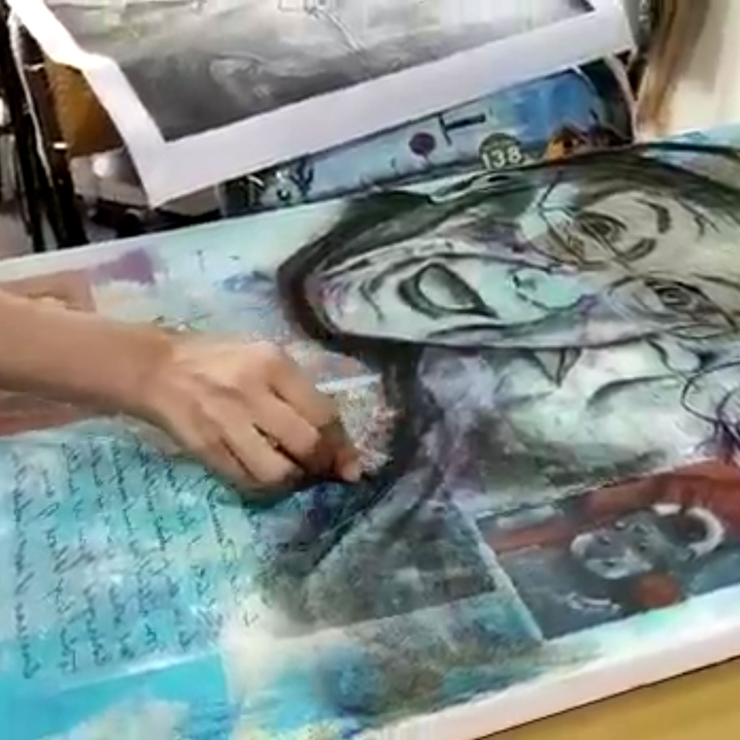 - Materials: Acrylic paints & inks, gel mediums, texture pastes, palette knives, charcoal, oil pastels, collage materials